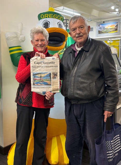 Jennie Keith and Roy Fitzgerald of Lewes took the Cape Gazette on the road—posing with the Mighty Duck mascot at the University of Oregon in Eugene. The couple was in town visiting their granddaughter, Celia Fitzgerald, an English major in the Honors College at U of O. Their stop in Eugene was part of a cross-country train adventure that began in Philadelphia and included visits to Bainbridge Island, Washington, where Jennie’s sister Harriet Alexander resides, and to San Francisco. Their return journey featured a ride aboard the spectacular California Zephyr, a legendary train that crosses the Rocky Mountains on its scenic two-day trip to Chicago.