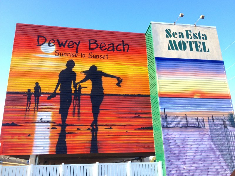 Titled “Dewey Beach – Sunrise to Sunset,” artist Andrew Dera painted the mural in 2015 on the southern wall of the Sea Esta Motel III on Route 1. The sunrise section of the mural was from the vantage point of a person standing at the top of a dune crossing and looking out over the soft blues, pinks, yellows and reds of a sunrise. The sunset section featured silhouettes of people enjoying the shallow waters of the bay on one of those hot summer nights that are full of bright reds, yellows and oranges. Similar to the menhaden mural in Lewes, I thought it captured the feel of Dewey pretty well. I especially liked the bright colors.