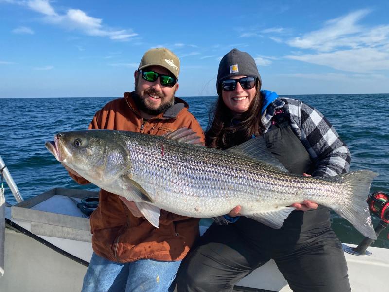 I got a firsthand report from my friend Keith Kaufman. His son Cody heard about the striped bass run off the Delaware coast and came down last Thursday with his girlfriend Jayde Tyson. On Friday, they all went out of Indian River Inlet on Keith’s boat and trolled CD-30 Bomber plugs. They caught and released a 47- and a 37-inch striped bass inside the Three-Mile Limit.