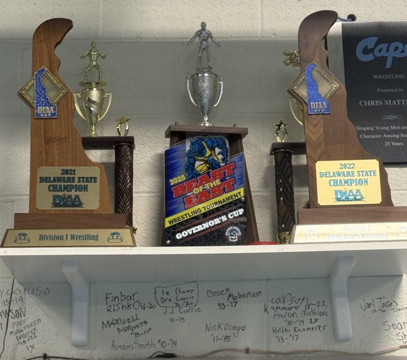 In My Room - “Do my dreaming and my scheming. Lie awake and pray. Do my crying and my sighing. Laugh at yesterday.” – Beach Boys, 1963. Move over, Cape state championship team trophies from 2021 and 2022, the 2025 Beast of the East Governor’s Cup is coming between you on the shelf in the room of reverence. The Governor’s Cup is awarded to the Delaware team that scores the most points in the Beast of the East tournament. Cape had 57 in the event at the University of Delaware. The Vikings were followed by Delaware Military Academy with 48, Caesar Rodney with 32.5, Smyrna with 32.5 and Salesianum with 24. Cosmically connected, Cape’s beach boys from 2021 and 2022 were known as the Basement Boys because they worked out together in Uncle Buck’s basement. If you know, then you know.