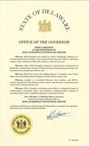 “Reaching 100 years is a remarkable milestone,” said Donna Seefried, vice president and general manager of RAPA Scrapple. “This proclamation is a meaningful recognition of our Delaware roots, our history in Bridgeville and the generations of customers who have made RAPA Scrapple part of their family traditions.”