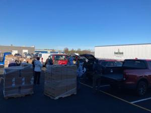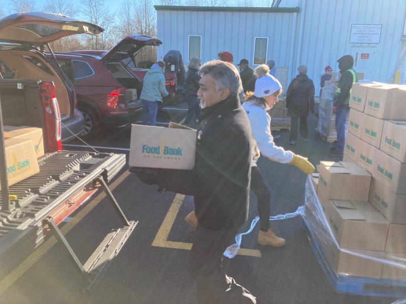 Harry K Foundation founder Harry Keswani was on hand for the distribution at Food Bank of Delaware’s Milford facility Dec. 20, and he helped load boxes onto trucks. The boxes included ham and fixings such as dressings, canned vegetables, and pie crust to make dessert.