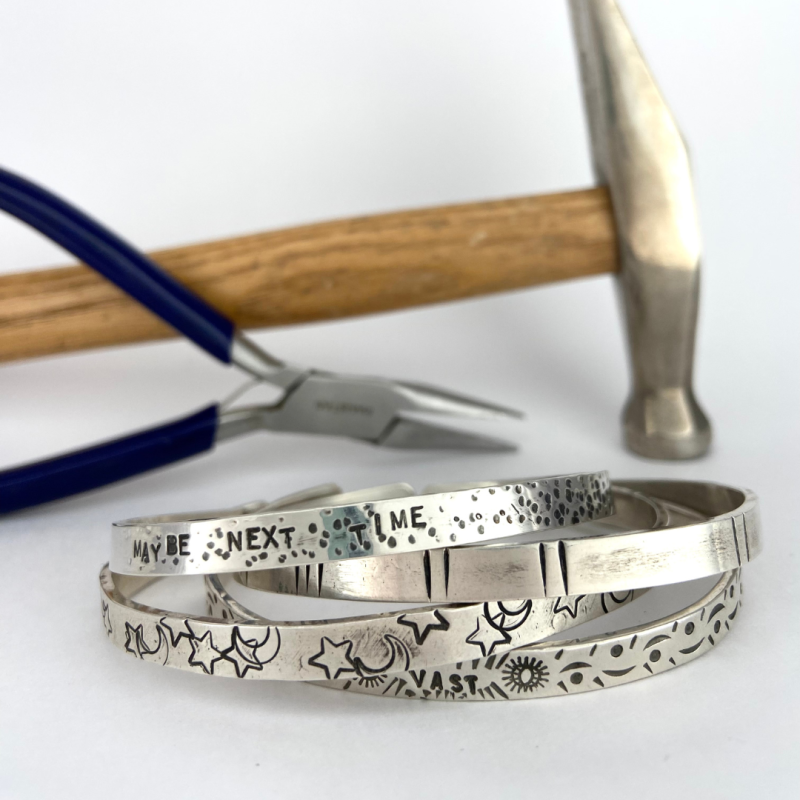 Heidi Lowe Gallery offers classes for people to make their own silver jewelry pieces. Offerings include stacker rings, mantra bracelet and rings of intention. Students will learn various metalworking techniques to make a wearable piece of personalized silver jewelry from start to finish in one session of about two-and-a-half to three hours.