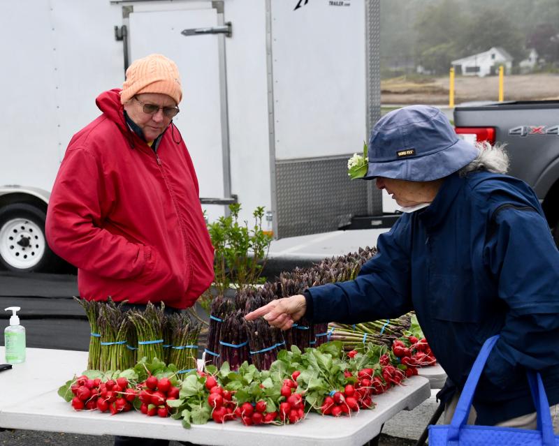 Market volunteer Joan Beck shops at the Stag Fun Farm booth with farmer Craig Brady ready to wait on her.