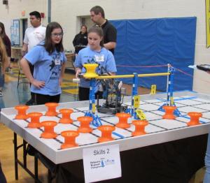 Students were judged on how well they used their battery-powered robots to stack colored hubs in building zones, remove hubs from a hanging structure, and park or hang robots on the hanging bar.
