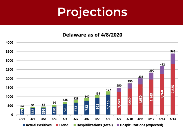 On April 9, Gov. John Carney revised previous projections with new estimates that would put 565 in hospitals by April 14 – a decrease from earlier projections that estimated 643 people would be hospitalized by April 12. Carney said the state will continue to be conservative in projecting future hospitalizations using 20 percent of the total number of positive COVID-19 cases to determine how many may end up in the hospital. The Division of Public Health reported the number of people hospitalized as of April 9 was 201.