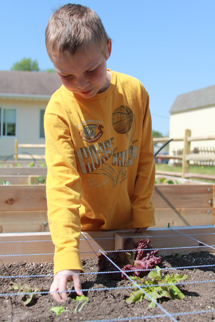 Perusing the nascent garden on a sunny morning, third-grader Aidan Reynolds explained how the garden was laid out.