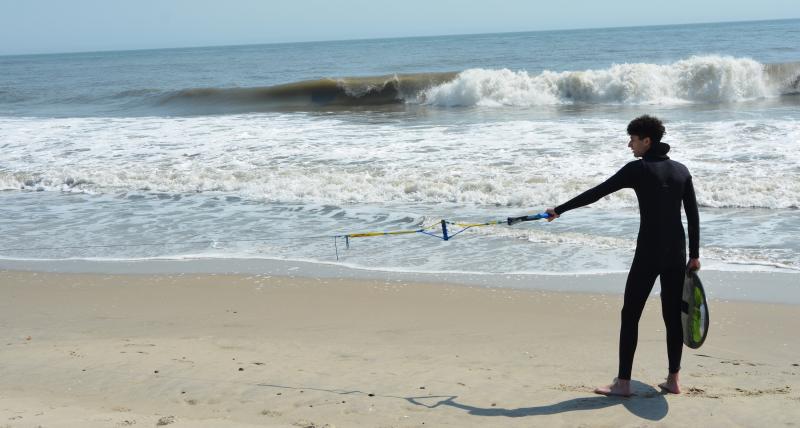 I was in Rehoboth Beach covering the Broadwalk on the Boardwalk. The walk ends at the very southern end of the Boardwalk before making its way down to the beach. I wanted photos of the walkers getting to the beach, so I made my way over the dune. As I did, I saw a young guy standing in his wetsuit, his left arm stretched out, holding a handle attached to a rope. As I scanned up the beach, looking to see where the rope led, I figured I would see a parachute laying on the ground, ready to be whipped up into the air for a kiteboarding ride.