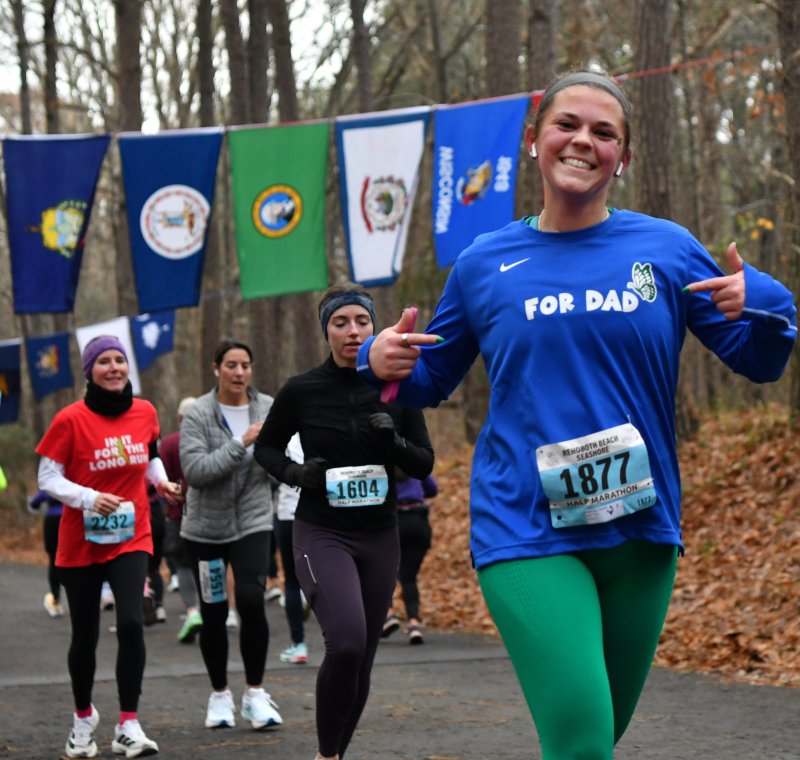Run for Dad - I’m a writer more than a reader, yet I read T-shirts and tattoos. The subjects are moving as I focus on torsos and bib numbers. Five thousand photos pared down to 15 albums of 100 runners taken last Saturday for the Rehoboth full and half-marathons. I received an email from a young woman, Cassidy Fox, who couldn’t find her photo. She gave me her bib number and described her T-shirt “Run for Dad.” She remembered me along the trail and, amazingly, I remembered her as the smile above the message. I knew it was a story I should chase. Luckily, it chased me, and I found the photo in focus, and Cassidy and I connected. She wrote, “I am an athletic trainer in a few public middle schools in northern Virginia. I love helping other people feel better physically, mentally and emotionally, and I love the world of sports – this gives me the opportunity to do both. I think I’d ultimately love to live at the beach, but for now Virginia is where I call home.” Cassidy shared a detailed story about her father's battle with cancer and her subsequent grief. She wrote, “My dad went to Potomac High School and the University of Mary Washington, where he met my mom – both in Virginia. I always imagine how different it must feel to my mom without him. I lost my dad, my superhero, but she lost the love of her life, best friend and father of her children. When I take a step back and imagine her perspective, I am always blown away at her strength.” Cassidy lost her dad Pete when she was 21. Her younger sister Mackenzie was 17 and older brother Brady was 24. Cassidy shared a long story of her family's journey. I read and heard it in an active voice (whatever that is). A friend recently asked me in jest, “Do you ever get tired of being around runners?” Without getting sappy like a December pine tree supporting the banners of Flag Alley along the Junction & Breakwater Trail, runners and their stories take me to the House of Spirits, a world of magical realism where we all, including our dogs, live in the eternal present.