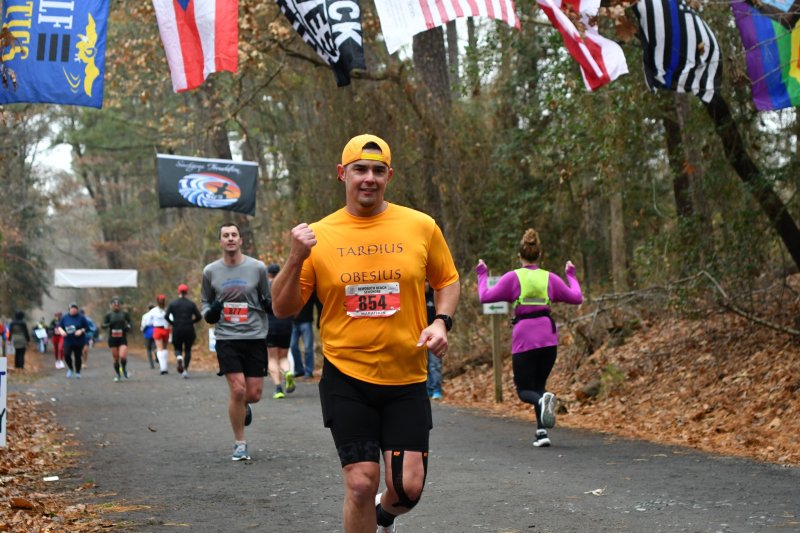 Tardius obesius - I read the shirt on Bib 854, and having taken Latin in Catholic school, I knew it meant “slow fat guy.” He is a Simpsons character, “Obeseus the Wide,” a satirical version of Homer Simpson. The runner is Jorge Roca of Cumming, Ga., who ran a 3:47:49 marathon for 231st place out of 594 finishers and 30th out of 71 in the male 35-39 age group. The big guy ain’t no joke.