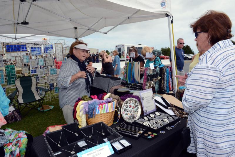 Sue Henry, left, from Everything That Glitters, gives a demonstration to Mary Ann Maag from Bethany Beach on how to use a clasp with a scarf.