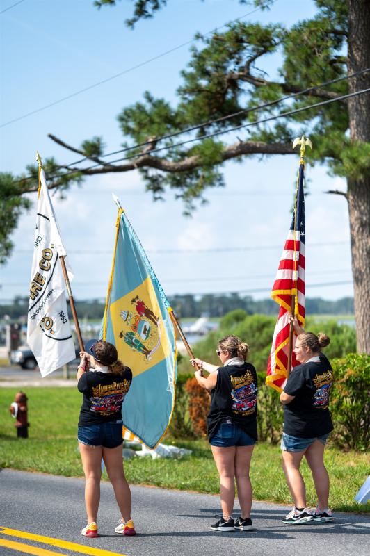 The flags of Indian River Volunteer Fire Company, the State of Delaware and the United States lead the parade.