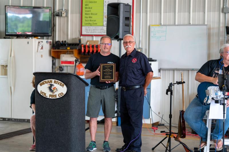Millsboro Councilman Ron O'Neal, right, presents Indian River Volunteer Fire Company President Patrick Miller with a plaque.