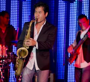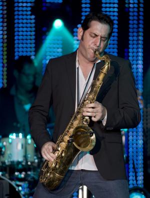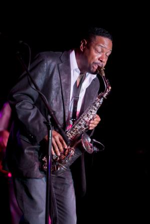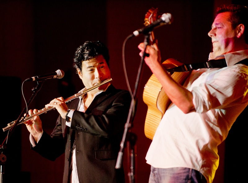 Sax pack player Jeff Kashiwa borrowed his daughter's flute Oct. 13, to accompany Marc Antione on guitar at the Rehoboth Jazz Festival.