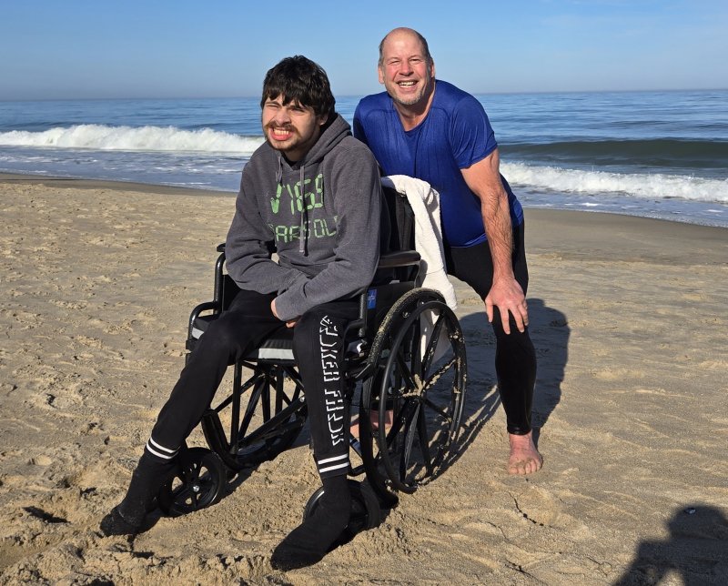 Peter was with his son Maxent, a 24-year-old with Angelman syndrome, which is a rare neurogenetic disorder. The water was much too cold for Maxent, but Peter said he gets out there in the summer.