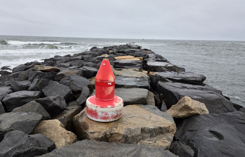 To my surprise, the buoy – identifiable by a worn sticker near the top – was still around, but it was now sitting on top of the north jetty. I hit pause on getting the photos I needed for my story and went to check it out. This time around, the cinder blocks and chain were gone.