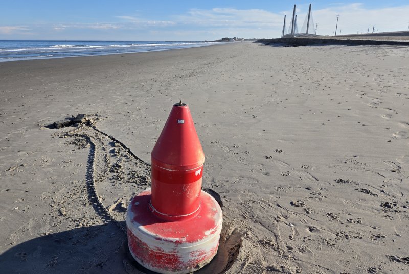 Our walks on the beach always start with a scan of the surroundings from the top of the dune. A few hundred yards to the north, I could see something sitting up on the sand. As we meandered in that direction, it became clear the object was a large red buoy. Upon further examination, we saw the buoy was attached to four cinder blocks via a 20-foot-long chain. At the time, after kicking it around a bit, we talked among ourselves about the type of energy it would have taken to move the buoy from wherever it came.