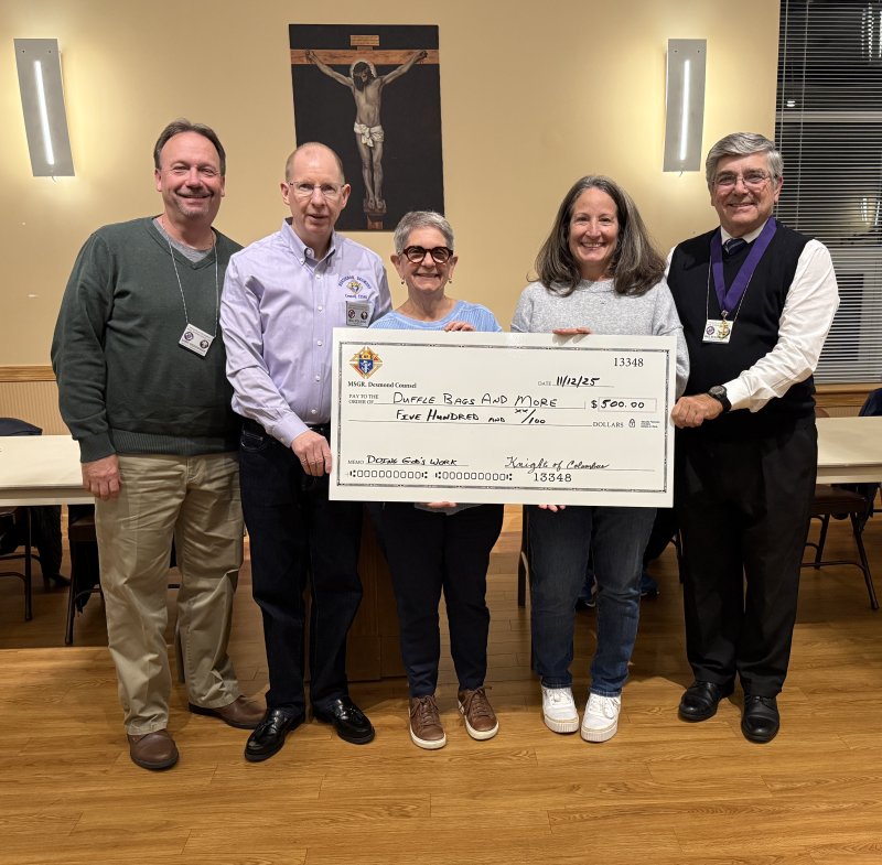 Members of the Knights of Columbus Msgr. Francis J. Desmond Council 13348 of Lewes recently presented a check for $500 to Duffle Bags and More.