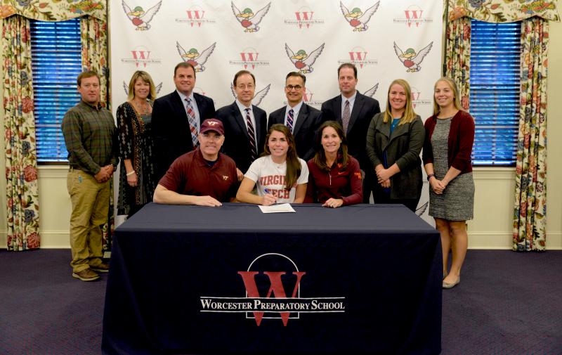 Worcester Preparatory School senior Leigh Lingo of Rehoboth Beach signed her National Letter of Intent to play Division I women’s lacrosse at Virginia Tech in Blacksburg, Va. Lingo was honored at a ceremony Nov. 9 at school surrounded by her family, coaches and school administrators. In addition to being in the National Honor Society and Spanish National Honor Society, Lingo’s impressive record includes U.S. Lacrosse All-American, ESIAC Player of the Year in both lacrosse and basketball as well as all-conference in field hockey, basketball and lacrosse. This month, Lingo was named a School Winner in Wendy’s High School Heisman for her dedication in the classroom, on the field and within the community. WPS Director of Athletics Matt McGinnis added, “It has been amazing to watch Leigh Lingo develop over the last four years as a student-athlete. Because of her relentless effort and amazing work ethic, she now has a chance to take her academic and athletic talents to the next level.