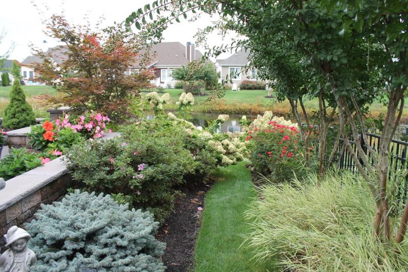 The Schnabels created a serene landscape and a backyard courtyard for interest and enjoyment all year. Ellen’s vision was to provide a well-balanced garden with several focal points, particularly in the backyard with a multitude of courtyard container plantings, elm, crepe myrtle and maple trees, grasses and limelight hydrangeas that frame the lovely pond and water fountain. She utilizes containers for evergreens on the courtyard so there are pretty plants to view in the winter. Her beautiful crockery is highlighted with bright spots of colorful flowers.