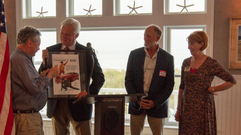 Lewes Mayor Ted Becker thanks Kevin Fleming for photographing and designing ads for an early 2018 chamber campaign promoting downtown Lewes businesses. Fleming also photographed and designed the framed 2006 ad being presented by Becker, in which Fleming dressed as Austin Powers and Lewes Chamber Executive Director Betsy Reamer portrayed Catwoman to promote the annual British Motorcar Show. Shown are (l-r) Fleming, Becker, Cape Gazette Publisher Dennis Forney, and Reamer.