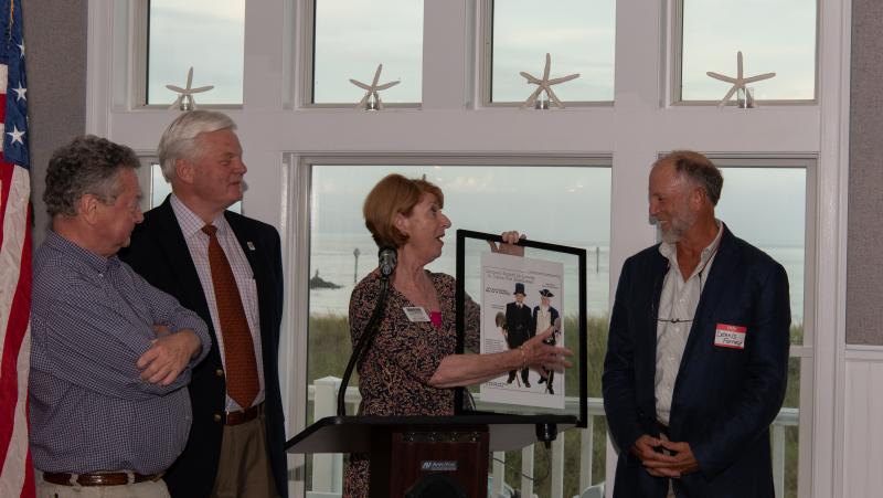 Lewes Chamber Executive Director Betsy Reamer thanks Cape Gazette Publisher Dennis Forney for the paper’s recent donation of full-page ads promoting downtown Lewes businesses during a city utility construction project. Reamer is presenting a framed copy of an ad from a 2006 chamber campaign promoting Presidents Day Weekend in Lewes. In the ad, Forney is dressed as Abe Lincoln and current Lewes Mayor Ted Becker portrays George Washington. Kevin Fleming photographed and designed the ad. Shown are (l-r) Fleming, Becker, Reamer and Forney.