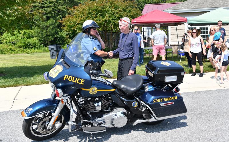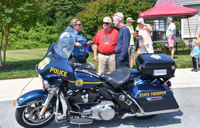 Helicopter pilot Craig Lewis provided an overview of helicopter operations, capabilities and the numerous types of missions he flies, including providing support for presidential visits. Trooper Robin Brown, representing the Motorcycle Unit and also the Community Engagement Unit, spoke to residents about her Harley-Davidson Police Electra Glide. Trooper Lewis Briggs from the Community Engagement Unit answered questions about the state police and also shared opportunities for a career with DSP. And, of course, there was Viper, a Belgian Malinois with the K-9 Unit, who with her handler Trooper Tyler Botchie, demonstrated her acute explosive-detecting and -sniffing skills.
