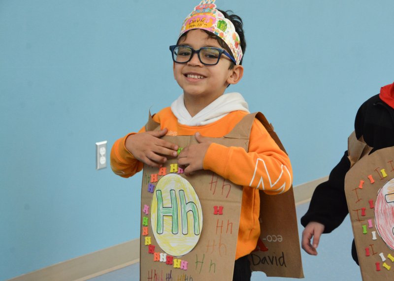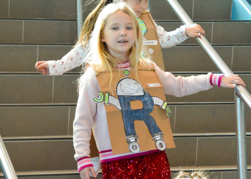 As part of the activity, each kindergarten student selected a letter of the alphabet and created a paper bag vest featuring that letter. Students carefully decorated their vests with drawings and images that represented words beginning with their chosen letter. The project also incorporated Spanish vocabulary, highlighting the school’s Spanish language immersion program and giving students the opportunity to showcase bilingual learning. From “P” is for pato (Spanish for duck) to “R” for robot, the creative designs reflected both imagination and growing language skills.