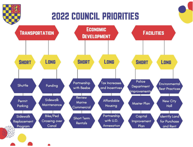 Categorized into three sections and divided into two timelines are the 2022 priorities of Lewes Mayor and City Council. Topics about transportation, economic development and facilities have been identified as needing attention. Following a December 2021 meeting with the Institute for Public Administration, city officials began working to address the various areas of need. Officials discussed progress during an Aug. 30 workshop.