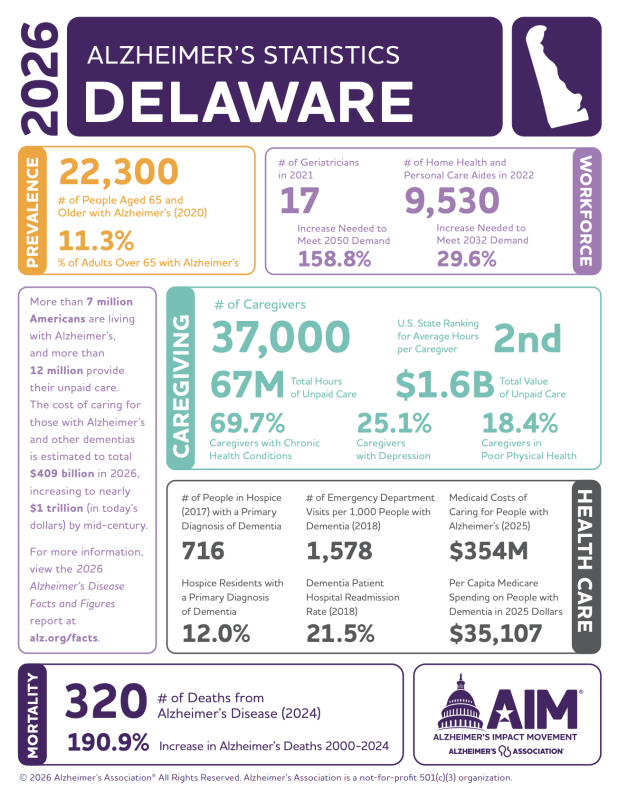“Supporting someone living with dementia comes with both unique challenges and meaningful rewards,” said Erica Holmes, Alzheimer’s Association Delaware Chapter programs manager. “By attending this symposium, dementia caregivers will benefit from practical information they can put to use right away, along with opportunities to connect with fellow caregivers and professionals who understand their experience.