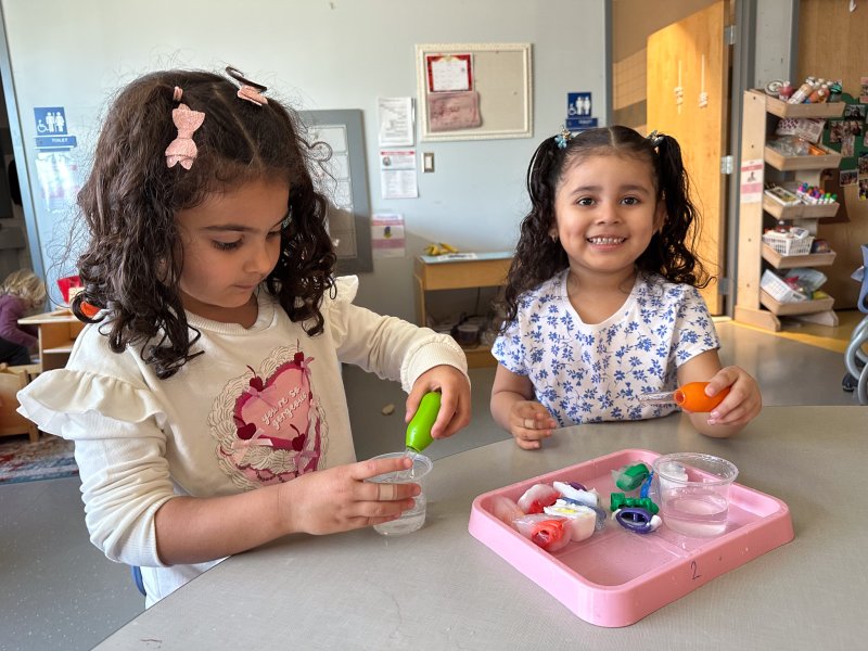 Students in Amanda Bogan’s class brought some snow indoors for a fun science experiment. Using droppers and a variety of liquids, children tested which ones could melt snow fastest while strengthening fine motor skills through careful squeezing and pouring. As they made predictions, watched the snow change and shared their ideas, students practiced early science skills such as curiosity, observation, and cause and effect in an exciting, hands-on way suitable for 3-year-olds.