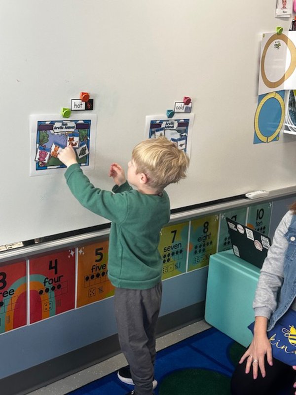 In Charity Elliott’s class, the 4-year-old students began by reading “Polar Bear Island.” Then they worked together to sequence the story, helping them strengthen comprehension and recall skills. Hands-on activities followed, including matching animal shadows, sorting Arctic and non-Arctic animals, and exploring spatial concepts using Arctic animal figures.