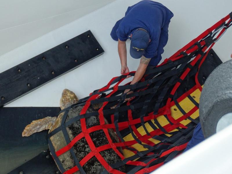 The crew of the Lawson worked in conjunction with the cutter’s small boat crew to use a cargo net to scoop up the turtle. Given the opportunity to name the female turtle, crew members called her “Tammie,” after the historic Coast Guard Cutter Tamaroa.