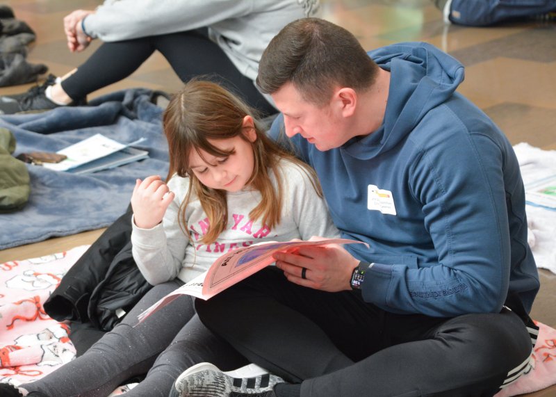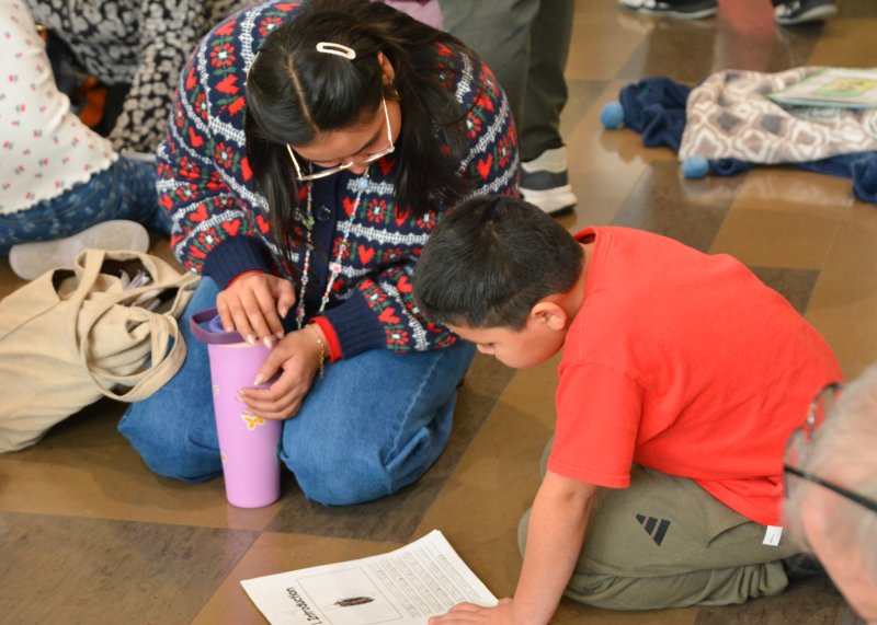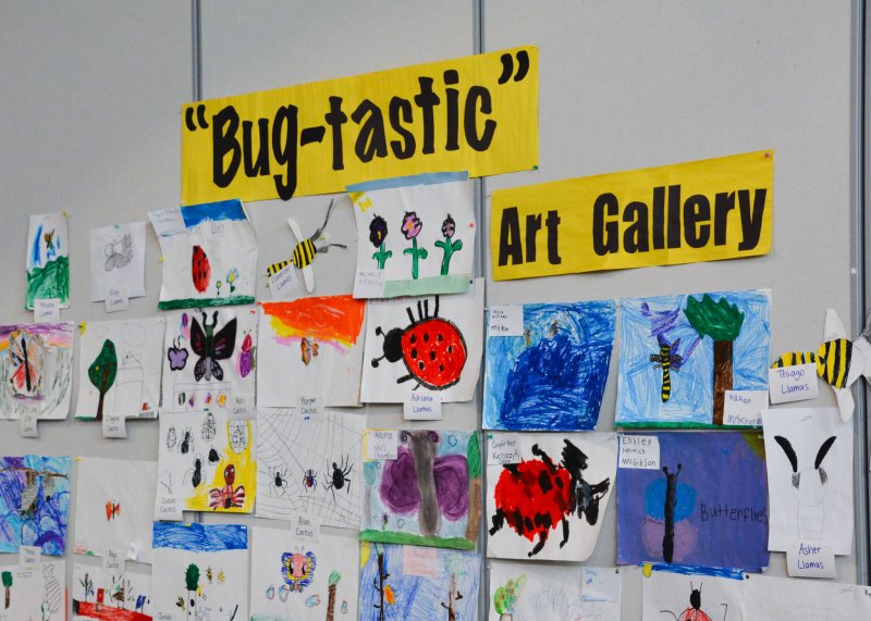 At Love Creek Elementary, students invited family members to join them for a cozy reading experience of books they had created. Students brought blankets and sat together with guests as they read through books featuring research and information about each student’s chosen bug. The relaxed setting encouraged meaningful conversations and allowed students to proudly share their learning as developing authors and researchers. Students also created a wall display of art created during their related arts classes, showing the various types of bugs they were learning about. From bright, colorful butterflies to creepy-crawly spiders, students were thrilled with the chance to showcase both their writing and art pieces.