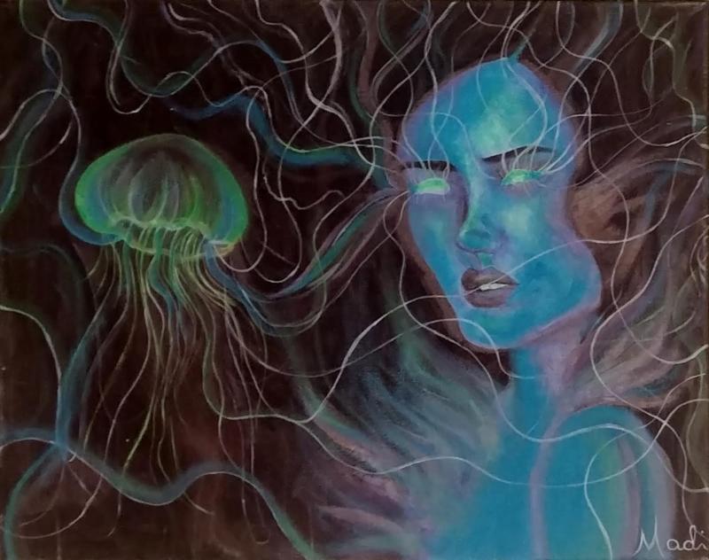Many of the original paintings in this exhibit, such as "Deep Sea Creatures," are created with acrylics. Griffin likes using acrylic paint because it dries very quickly. However, that can make blending colors a challenge, so she adds a slow-drying paint medium to any parts of the piece she wants to blend exceptionally well.