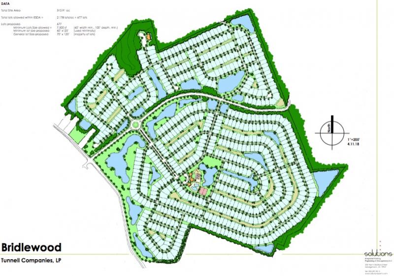 Bridlewood, near the intersection of Banks Road and Green Road, Long Neck, includes 667 lots on 301 acres of agricultural-residential, AR-1, land. The traffic count is estimated at 6,566 vehicles on an average weekday. The developer is Baywood LLC and Sussex Realty Co. of Long Neck.