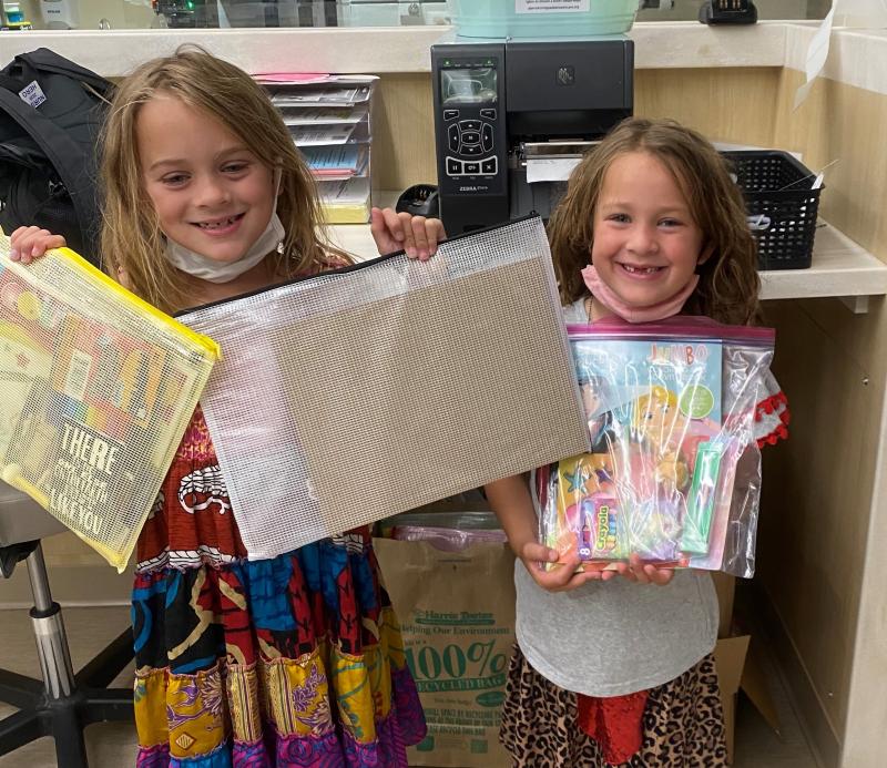 Caroline had fun preparing the bags for the babies, and she understood that they only needed a "stuffy and a book, no little items." She also loved making the bags that had Bluey and Pokémon, saying, "These are the best; it'll make the kids so happy." It took a few days to stuff more than 150 Busy Bags. The girls would get up in the morning and start stuffing all by themselves. They even had some of the neighborhood kids helping.