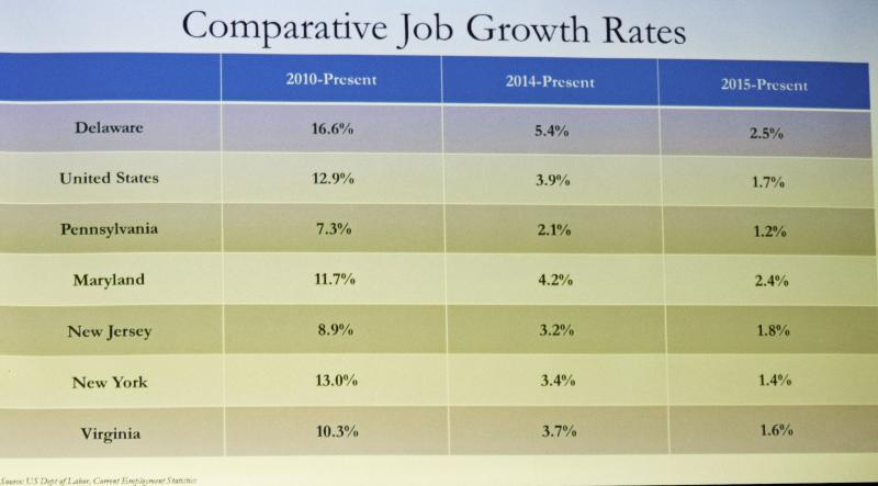 “Our job growth has significantly outpaced the job growth of every other state in the region, as well as the country overall,” Markell said during a speech at the Rehoboth Beach-Dewey Beach Chamber of Commerce's general membership luncheon at King's Creek Country Club Oct. 19.