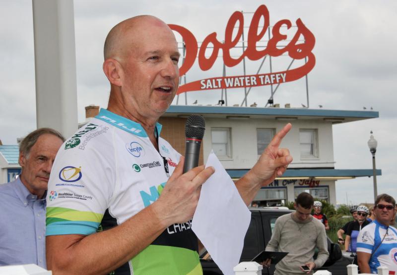 Mounting the steps in the shadow of the pink Dolle’s sign, Markell expressed his gratitude to all who had followed his journey blog, and to all those who sponsored the ride to raise the charity funds.