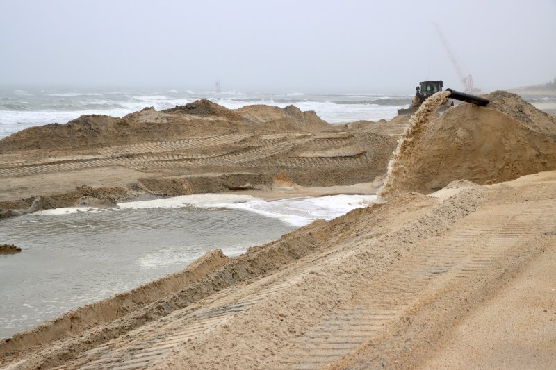 A bulldozer pushed sand through a man-made river on the north side of the Indian River Inlet.
