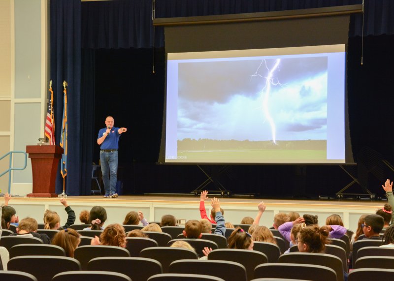 Safety was a major theme during the presentation. Wirdzek discussed best practices for seeking shelter during tornadoes and other severe storms, explaining that even homes without basements have safer interior spaces such as bathrooms, closets or rooms on the lowest floor. Students were fascinated by facts such as lightning reaching temperatures hotter than the surface of the sun, up to 50,000 degrees, and how the Washington Monument is struck by lightning hundreds of times each year.