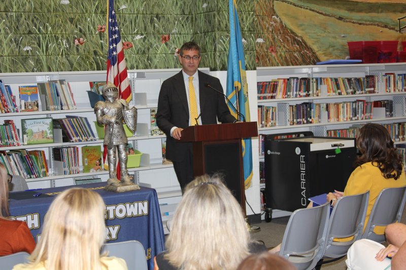 Standing in the school’s library surrounded by books, Meyer spoke of the importance of learning to enjoy reading. Today, he said, there are more distractions than ever, but he’s committed to improving the literacy rate among Delaware schoolchildren, recently declaring a literacy emergency in the state.