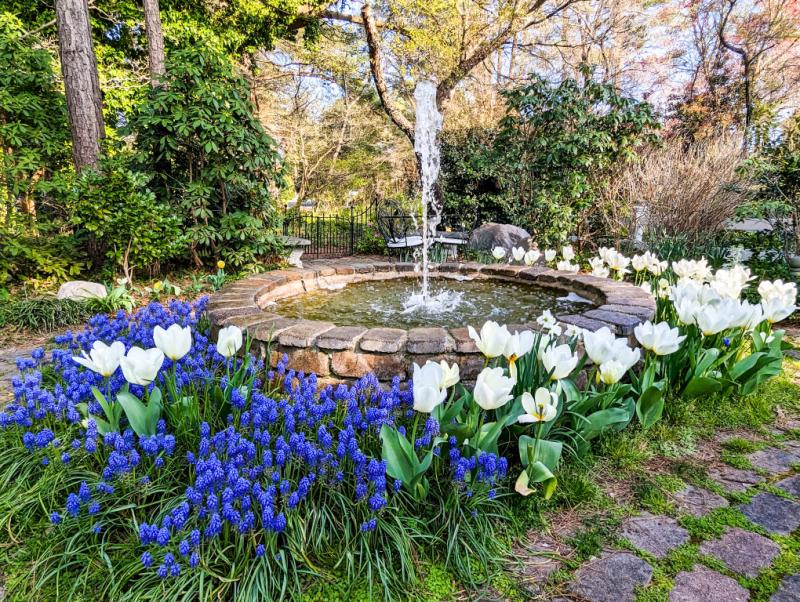 Mill Pond Garden encompasses beautifully landscaped grounds and 2,000 feet of pathways, graced with nine water features and opening onto vistas of Red Mill Pond with its abundant birds and other wildlife, all surrounded by stands of majestic native trees, especially giant oaks and loblolly pines.