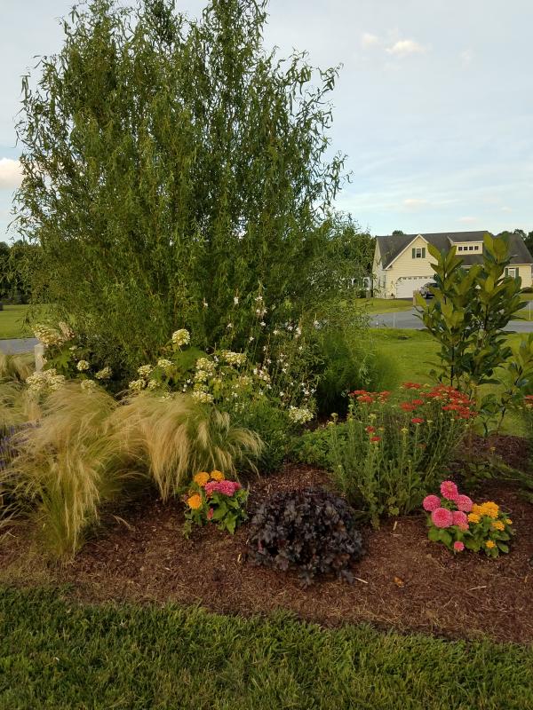 Just a short distance away in the Bridlewood development are the final two gardens on the tour. These gardens are larger than the in-town gardens. One features large sculpted garden beds full of trees, native perennials to attract pollinators, and many types of grasses. For color, 80 Royal Magenta Sunpatiens and 150 pink and purple Angelonia have been added. The other garden in Bridlewood is highlighted by 18 raised beds which provide herbs, fresh fruits and vegetables throughout the year. The raised beds, fence and archways provide a lovely setting.
