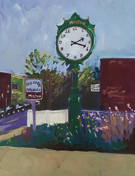 In 2015, the Milton Garden Club undertook the task of raising money to purchase a clock for the town center. The clock that had been there for years had stopped working and could not be repaired. With the support of the entire community, the garden club was able to raise more than enough money to purchase the clock. A local artist, Jean Bowers, painted a wonderful painting of the clock in the town center garden and has donated the painting to the garden club to use as a fundraiser. The club is auctioning it off.