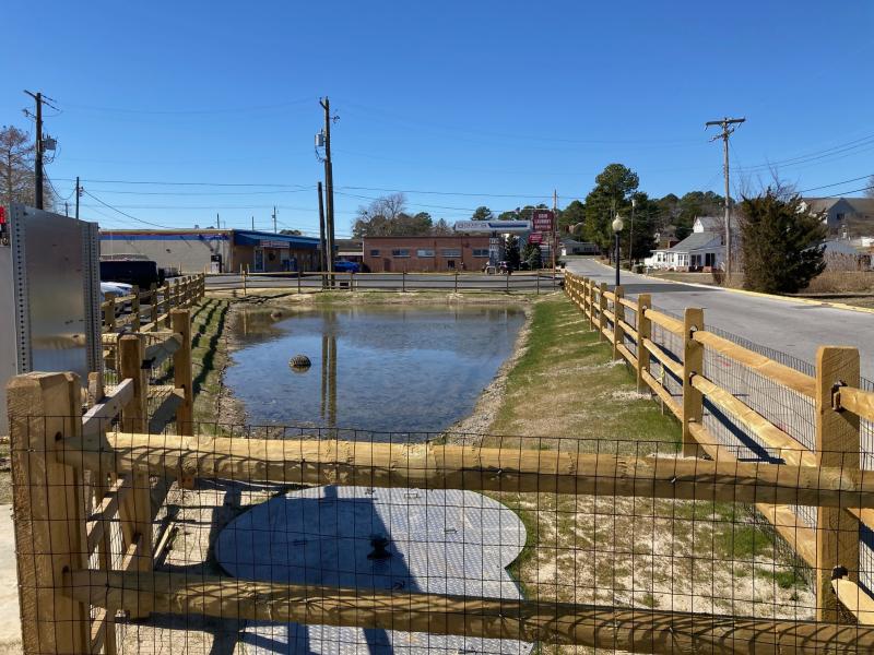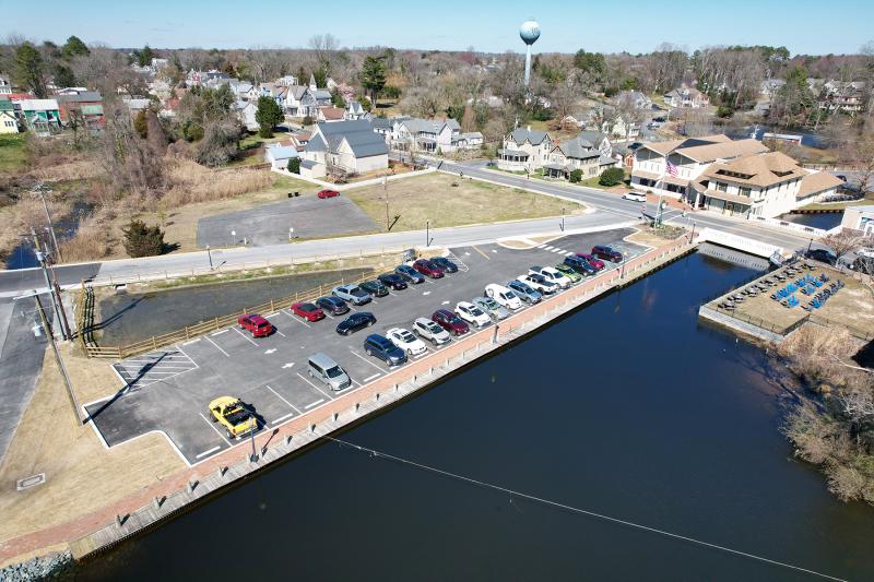 The project is aimed at curbing nuisance flooding and improving the bulkhead along the Broadkill River. The project includes a retention area, which functions like a rain garden, but it will also have a pump to circulate water away from the entrance to the parking lot. The parking lot was reoriented with one entrance and exit in the center of the lot. The wooden walkway along the river has been restored for pedestrian use.