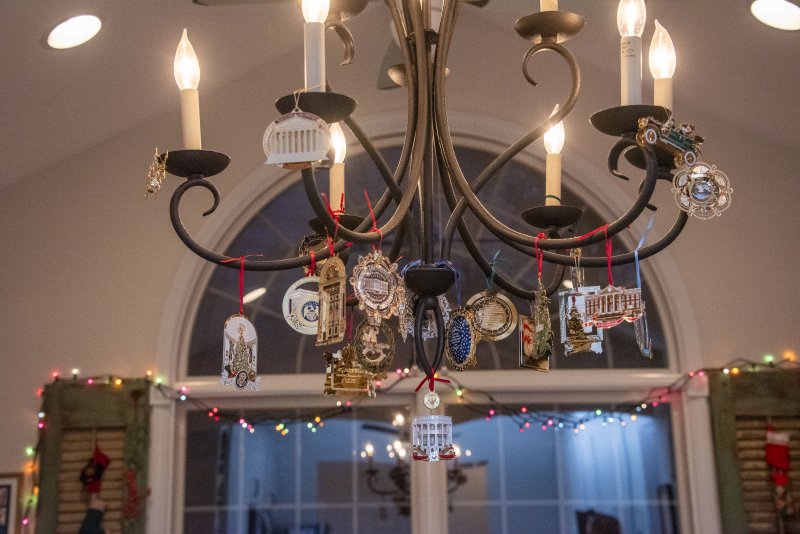 White House Christmas ornaments decorate the chandelier in the home of Lisa and Tom Malone in Wagamons West Shores.