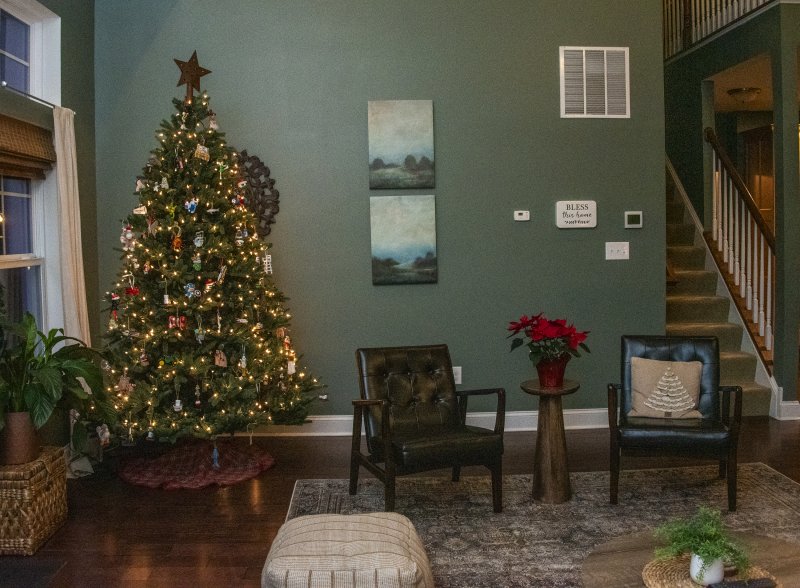 Family ornaments decorate the Christmas tree in the living room of Kelly and Chris Cole’s West Shore Drive home.