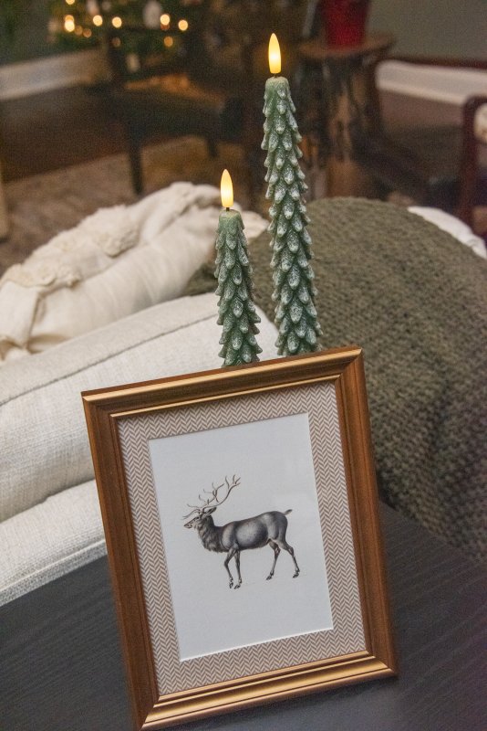 Fresh greens yoke a studious reindeer above the fireplace at Geri Ludlam and Connie Heindel’s Hudson Road home.