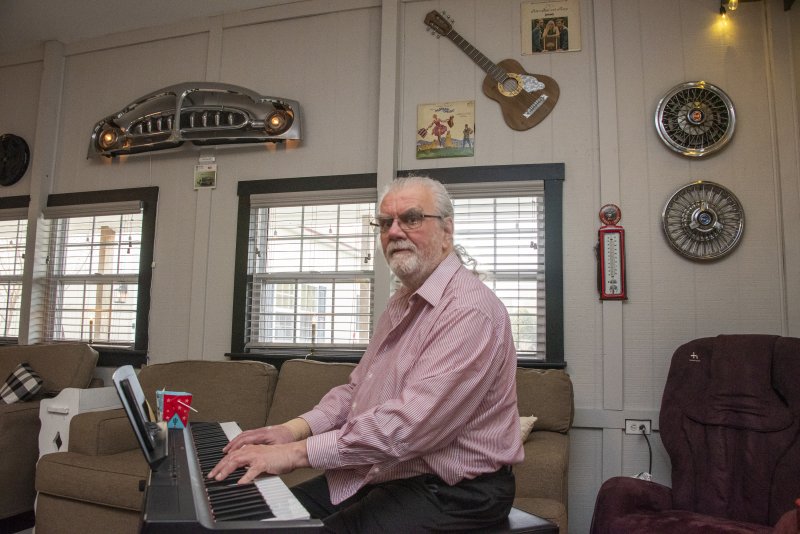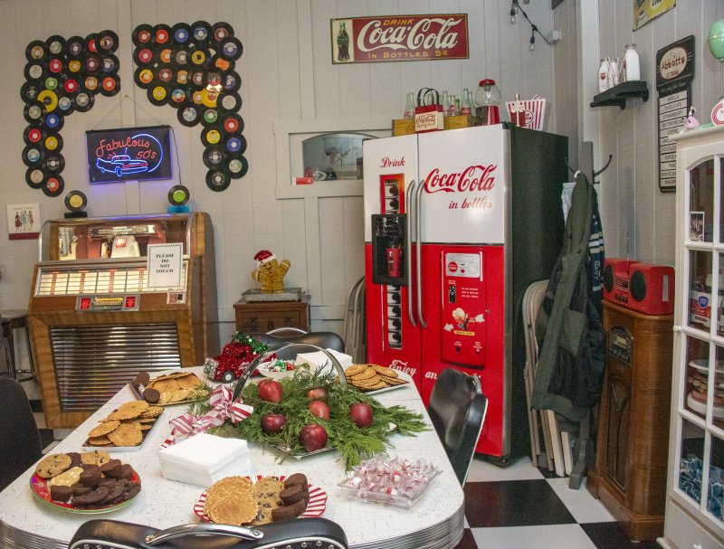 Joe Holt entertains tour guests in Geri Ludlam and Connie Heindel’s pole barn decorated with vintage memorabilia and musical themes.